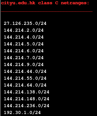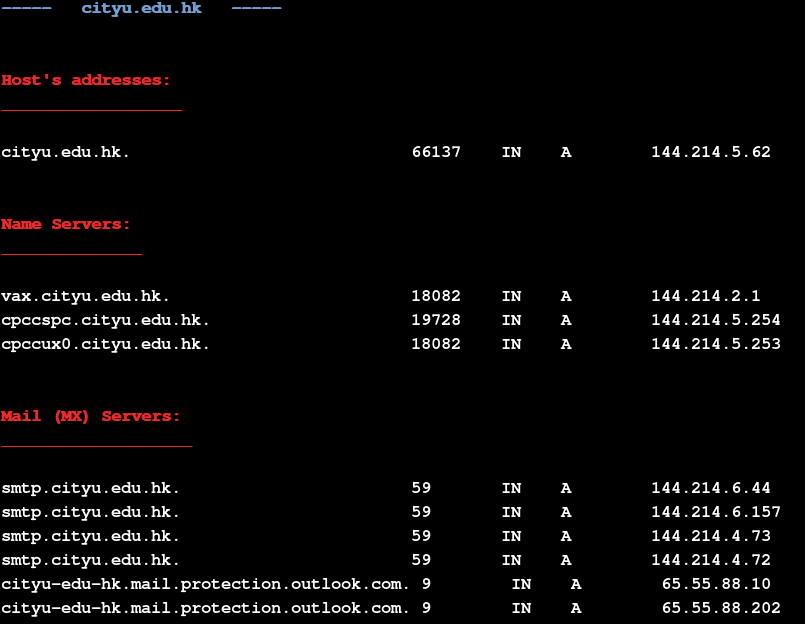 1 | # dnsenum --dnsserver 8.8.8.8 --enum -f /usr/share/dnsenum/dns.txt cityu.edu.hk |
